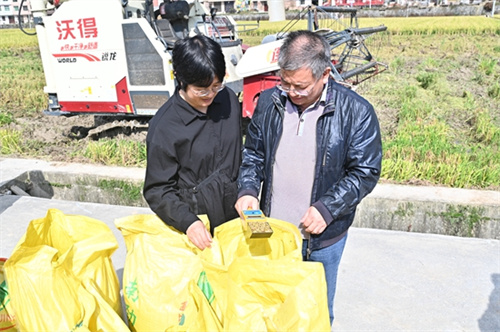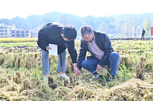 在隆回縣羊古坳鎮(zhèn)雷峰村超級雜交水稻高產(chǎn)攻關(guān)科研基地,由中國水稻研究所、湖南省農(nóng)業(yè)農(nóng)村廳、湖南農(nóng)業(yè)大學(xué)、湖南省水稻研究所等單位專家組成的測產(chǎn)專家組,現(xiàn)場隨機選取兩塊田進行機收測產(chǎn),按照農(nóng)業(yè)農(nóng)村部再生稻測產(chǎn)方法,經(jīng)脫粒、去雜、除水分、稱重的科學(xué)方法進行測量。