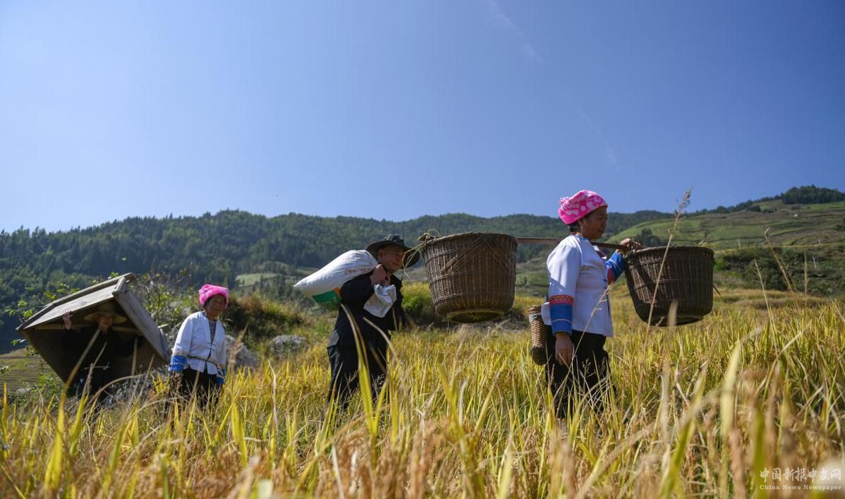 龍脊梯田之上一派豐收的喜人景象,成為了秋天的一道靚麗風(fēng)景。(中國日報(bào)社廣西記者站 石睿鵬)