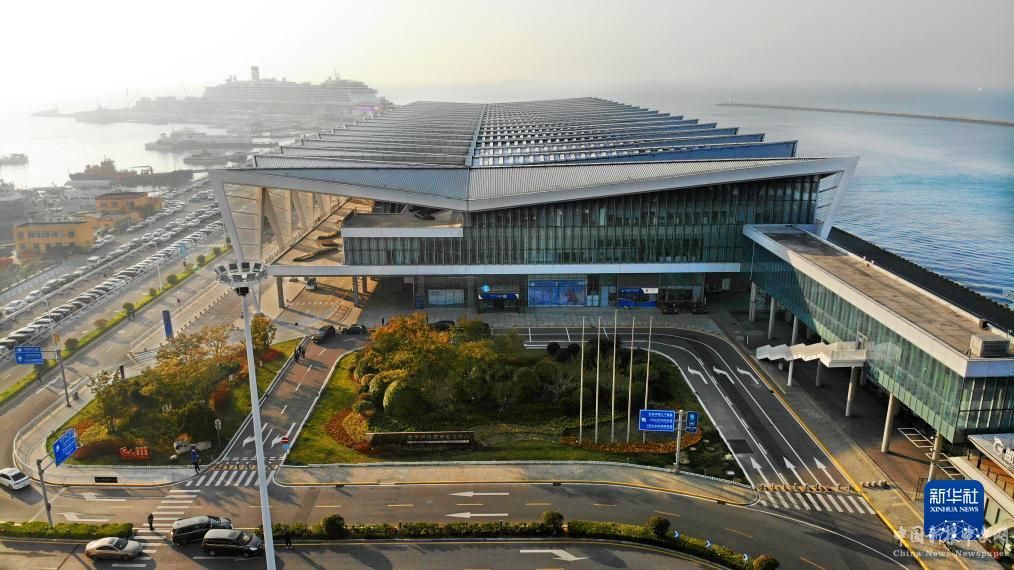 這是總建筑面積6萬平方米的青島郵輪母港客運(yùn)中心。其設(shè)計(jì)最高通關(guān)能力可達(dá)每小時(shí)3000-4000人次,年接待能力達(dá)150萬人次。主要功能為聯(lián)檢大廳,同時(shí)配套免稅商店等商業(yè)服務(wù)功能(11月21日攝,無人機(jī)照片)。