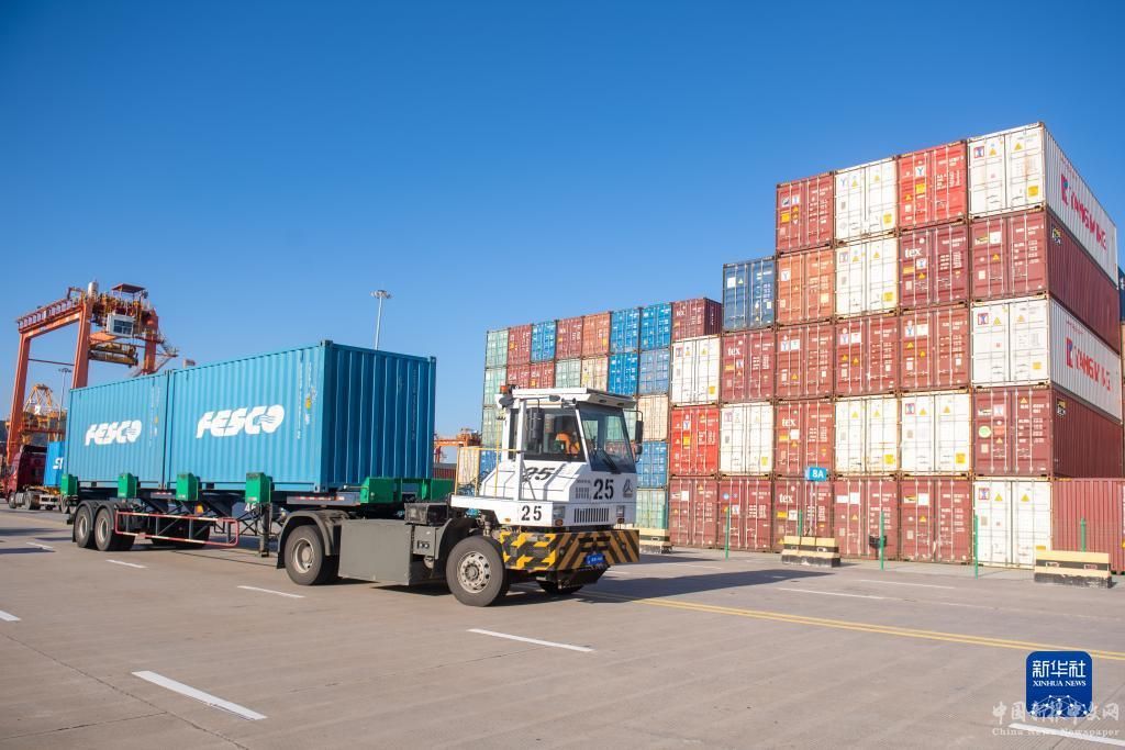 11月22日,裝載集裝箱的卡車行駛在溫州港狀元岙集裝箱碼頭內(nèi)。