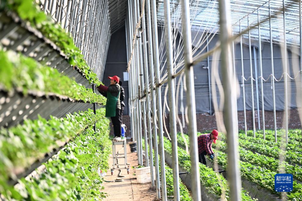 11月27日,農(nóng)民在白溝新城一處智慧農(nóng)業(yè)園為草莓疏果。