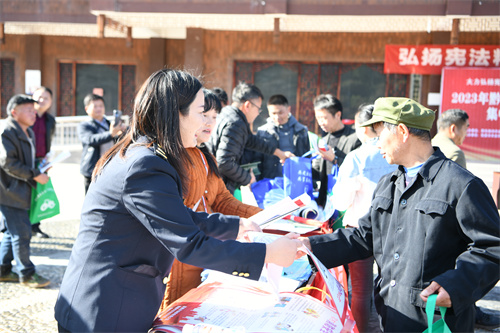 當(dāng)天,在曼洞村村委會廣場上,人頭攢動。村民們紛紛走向各法律服務(wù)咨詢臺,工作人員通過宣傳展板、發(fā)放法律宣傳資料和宣傳物品等形式,現(xiàn)場解答村民提出的法律問題,并引導(dǎo)村民依法表達(dá)合理訴求。