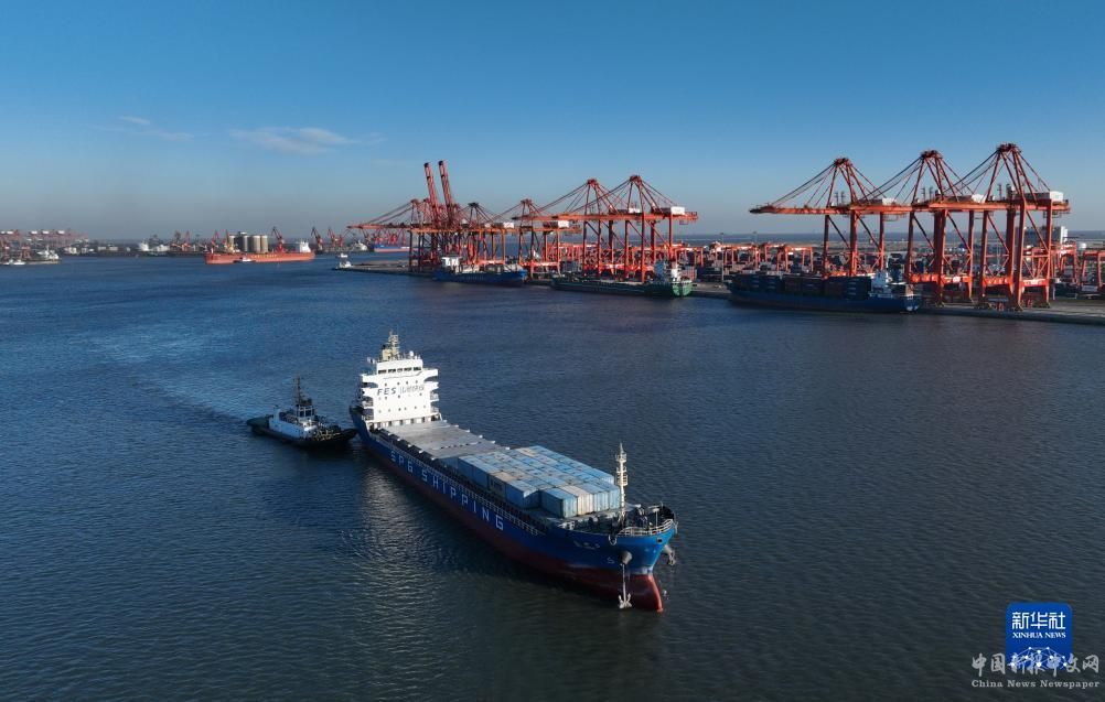 12月21日,一艘輪船在唐山港京唐港區(qū)集裝箱碼頭卸載后駛離港區(qū)(無(wú)人機(jī)照片)。