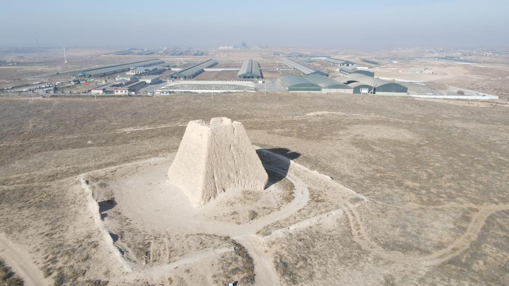 寧夏靈武市白土崗鄉(xiāng)白土崗烽火墩及遠(yuǎn)處的奶牛養(yǎng)殖基地(無人機(jī)照片,2023年12月12日攝)。新華社記者 許晉豫 攝