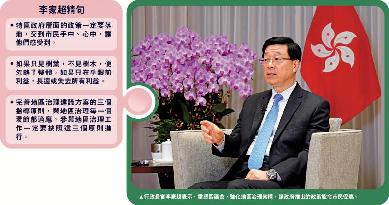 圖:行政長(zhǎng)官李家超表示,重塑區(qū)議會(huì)、強(qiáng)化地區(qū)治理架構(gòu),讓政府推出的政策能令市民受惠。
