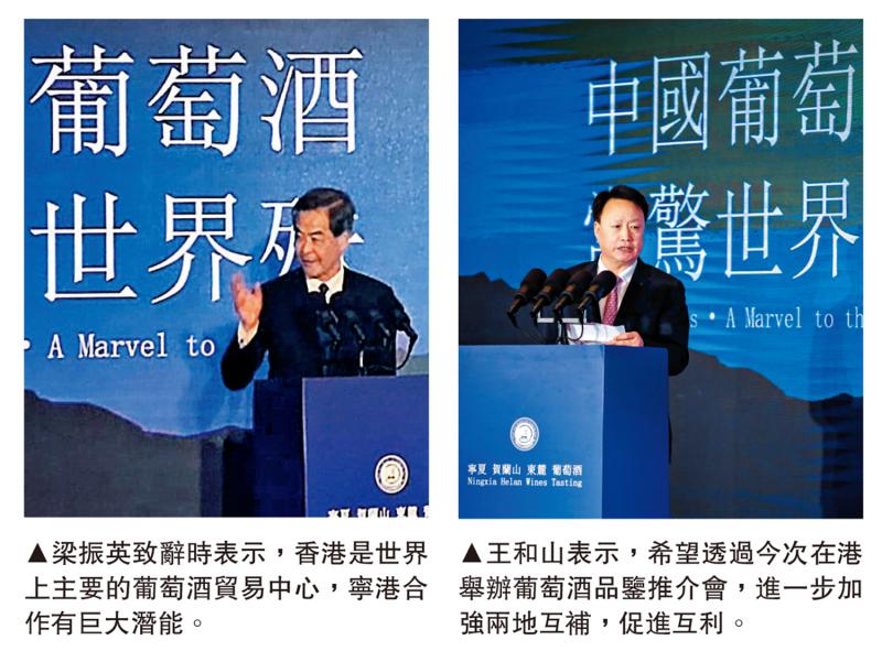 左圖:梁振英致辭時(shí)表示,香港是世界上主要的葡萄酒貿(mào)易中心,寧港合作有巨大潛能。右圖:王和山表示,希望透過今次在港舉辦葡萄酒品鑒推介會(huì),進(jìn)一步加強(qiáng)兩地互補(bǔ),促進(jìn)互利。