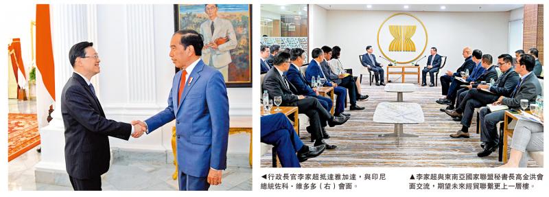 左圖:行政長官李家超抵達雅加達,與印尼總統(tǒng)佐科?維多多(右)會面。右圖:李家超與東南亞國家聯(lián)盟秘書長高金洪會面交流,期望未來經(jīng)貿(mào)聯(lián)系更上一層樓。
