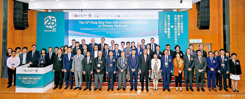 圖:“第12屆龐鼎元國(guó)際中醫(yī)藥研討會(huì)”暨港大中醫(yī)藥學(xué)院25周年院慶舉行,一眾嘉賓在臺(tái)上合照。