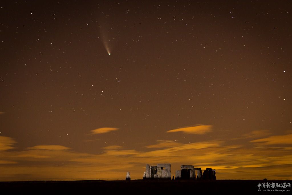 2020年7月23日,在英國英格蘭威爾特郡的巨石陣,新智彗星劃過天際。新華社發(fā)(蒂姆·愛爾蘭攝)