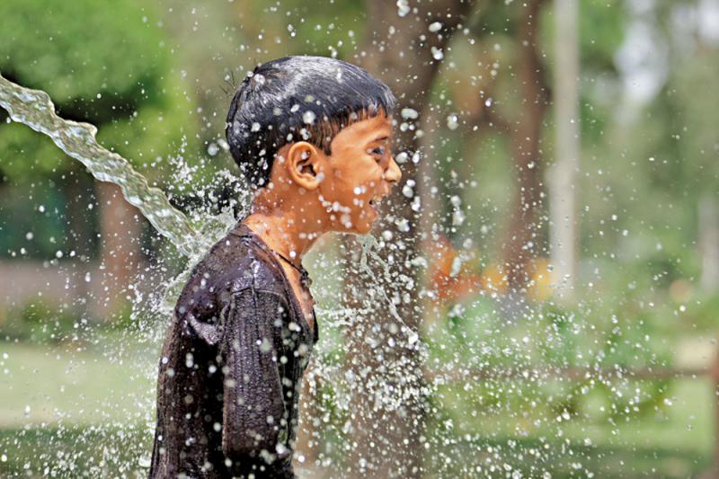 圖:印度遭遇高溫天氣,圖為北方邦勒克瑙的一名男孩19日在水管下降溫。\美聯(lián)社