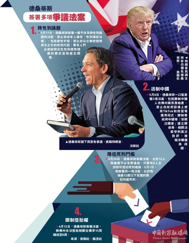 德桑蒂斯近期在佛州推出多項(xiàng)右翼色彩濃厚的法案,包括限制中國人在該州購買房地產(chǎn)、禁止政府設(shè)備使用TikTok和微信、降低死刑門檻、進(jìn)一步限制墮胎權(quán)等。17日,他簽署了一攬子涉及跨性別議題的法案,包括禁止未成年人接受變性手術(shù)和青春期激素治療、禁止公立學(xué)校師生使用男女之外的性別代詞、在政府設(shè)施內(nèi)必須按照出生性別使用相應(yīng)的更衣室和衛(wèi)生間等。