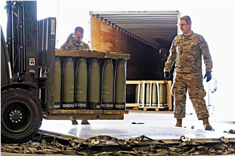 圖:美國對烏軍援不斷加碼,圖為美空軍基地向?yàn)蹩颂m運(yùn)送的彈藥。\美聯(lián)社