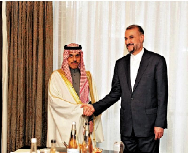 圖:2日,伊朗外長阿卜杜拉希揚(右)與沙特外交大臣費薩爾會面。\路透社