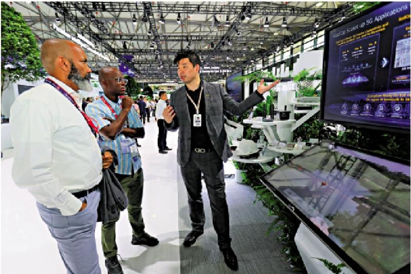 圖:上海世界移動通信大會6月開幕,工作人員在華為展臺為海外客戶進(jìn)行講解。\ 新華社