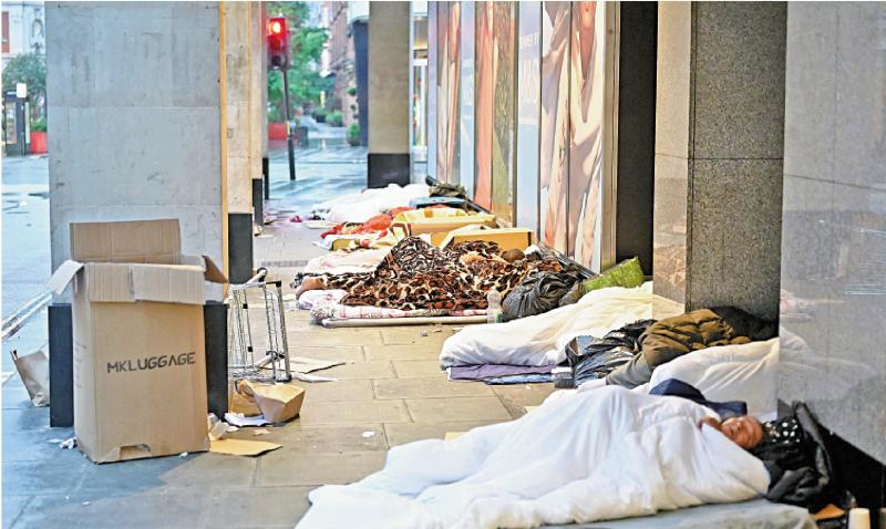 圖:2日,幾名露宿者躺在倫敦牛津街的商店外。\法新社