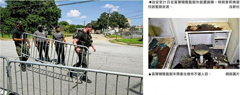 左圖:治安官21日在富爾頓縣監(jiān)獄外設(shè)置路障,特朗普即將前往該監(jiān)獄自首。/法新社;右圖:富爾頓縣監(jiān)獄牢房衛(wèi)生條件不堪入目。/網(wǎng)絡(luò)圖片