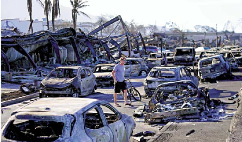 圖:8月11日,夏威夷山火燒毀了拉海納道路上的車輛。\美聯(lián)社