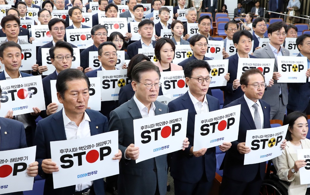8月24日,韓國(guó)最大在野黨共同民主黨黨首李在明(前排左二)與議員在首爾國(guó)會(huì)舉行的緊急會(huì)議上手舉標(biāo)語,抗議日本核污染水排海。新華社/紐西斯通訊社