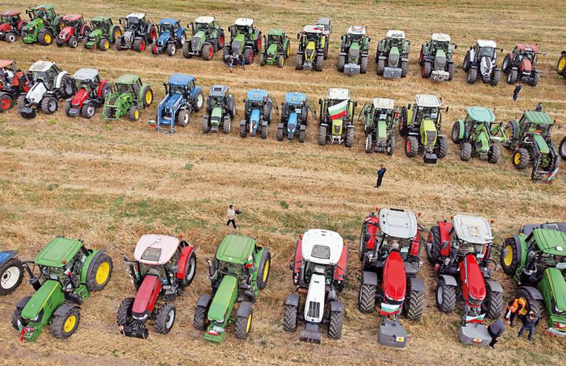 圖:保加利亞農(nóng)民19日將拖拉機(jī)開到農(nóng)田中示威,要求延長對烏克蘭糧食的進(jìn)口禁令。\法新社