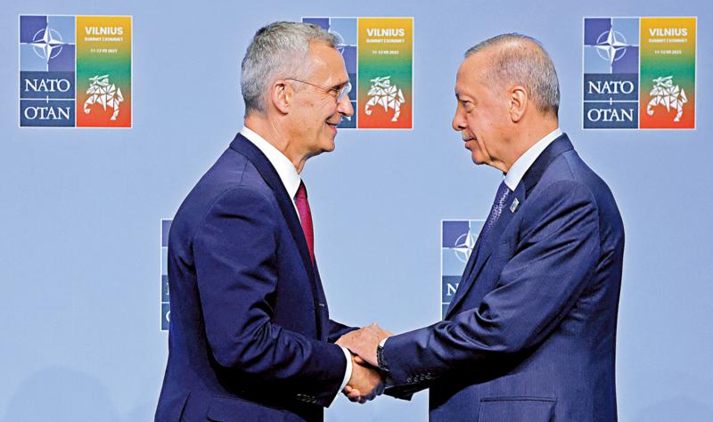 圖:埃爾多安(右)7月與北約秘書長斯托爾騰貝格握手。\法新社