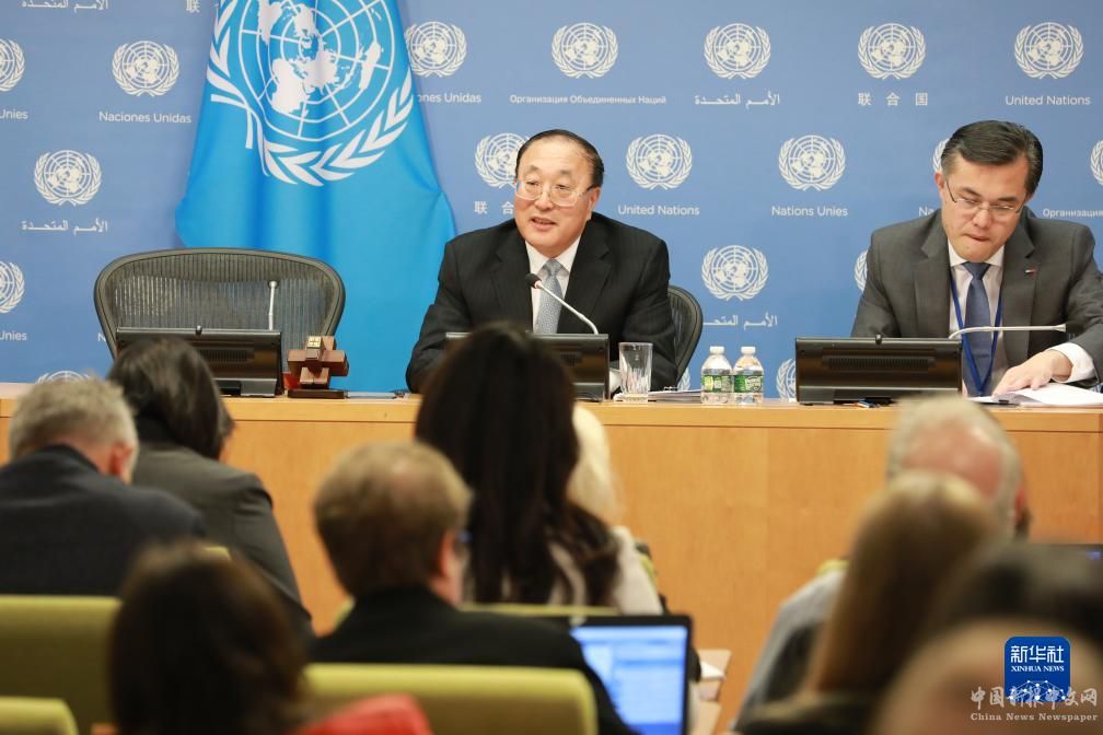 11月1日,在位于紐約的聯(lián)合國總部,中國常駐聯(lián)合國代表張軍(左)在媒體吹風(fēng)會上講話。新華社記者 謝鍔 攝