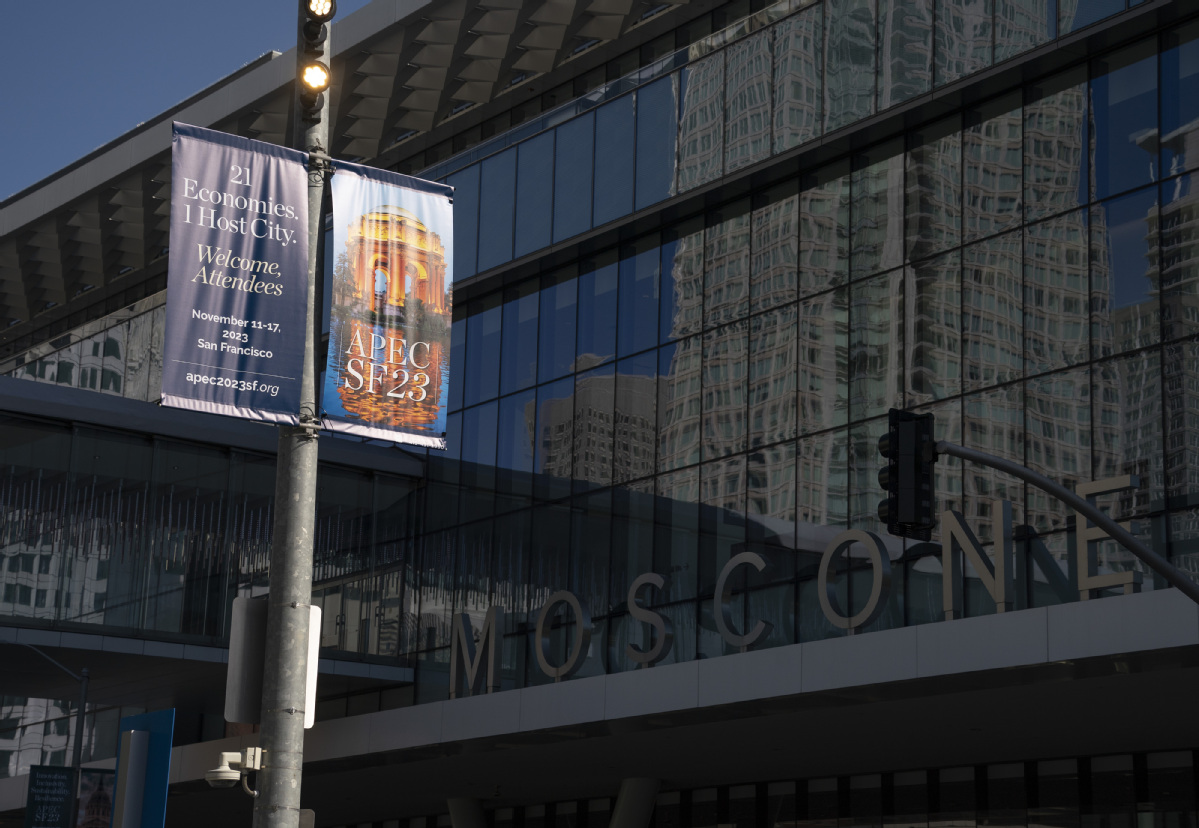11月7日在美國(guó)舊金山拍攝的亞太經(jīng)合組織會(huì)議場(chǎng)地外的宣傳海報(bào)。新華社發(fā)(李建國(guó)攝)