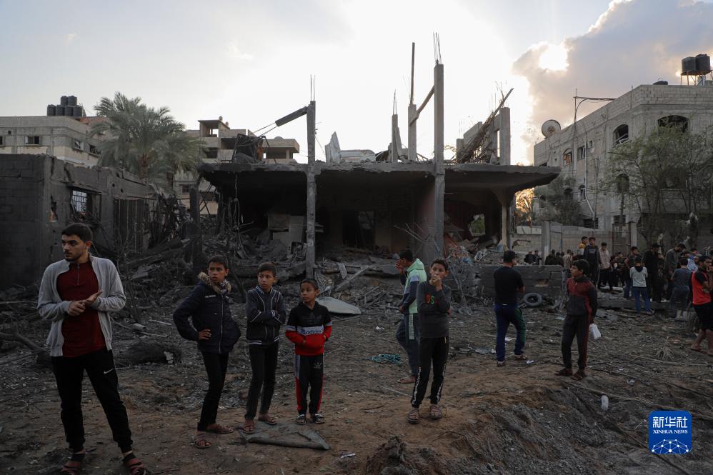 12月1日,人們聚集在加沙地帶南部城市汗尤尼斯一處被炸的建筑周圍。