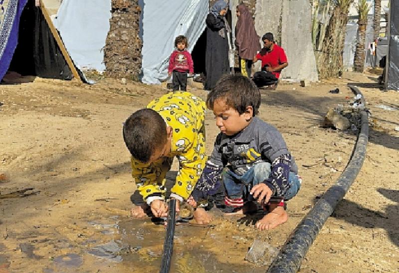 圖:加沙生存物資緊缺。圖為巴勒斯坦兒童8日接水喝。\路透社