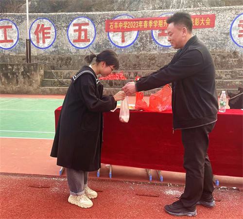 當(dāng)天,石羊中學(xué)舉行春季開學(xué)典禮暨表彰大會。該校對上學(xué)期品學(xué)兼優(yōu)的100名學(xué)生、10名優(yōu)秀老師進(jìn)行了表彰。獲表彰的師生每人獲得一串豬肉和一把面,這讓師生們感到既欣喜又意外。頒獎(jiǎng)時(shí),獲獎(jiǎng)師生贏得臺下500余師生熱烈的掌聲。