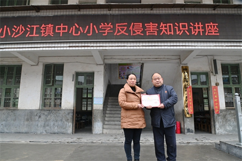 宣講結束后,小沙江鎮(zhèn)中心小學校長楊秋惠為劉任平庭長頒發(fā)了法治副校長聘書。(賀上升 郭石群)