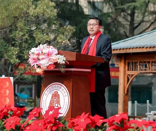 緊接著黨委書記兼校長(zhǎng)郭平貴、黨委副書記劉鵬、高三年級(jí)部長(zhǎng)周鵬、副部長(zhǎng)劉雪超上臺(tái)為高考倒計(jì)時(shí)100天揭牌。