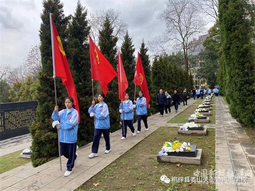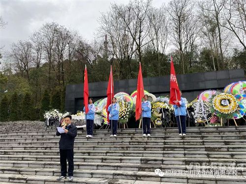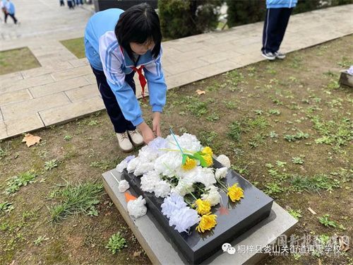 學(xué)生代表向烈士敬獻(xiàn)花籃,在革命烈士墓碑前,全體師生懷著沉重的心情低頭默哀三分鐘。