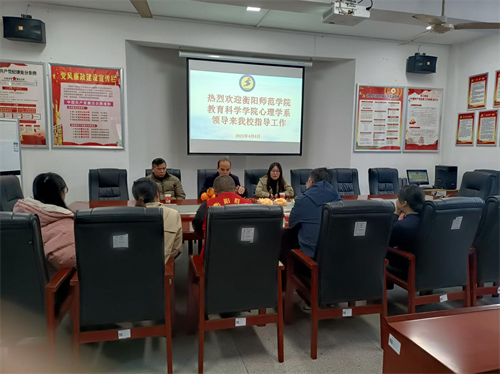學(xué)院領(lǐng)導(dǎo)對該校這些年來的發(fā)展給予了充分肯定,對學(xué)校打造心理健康教育特色品牌所做的各項工作及取得的成績高度認可。在了解到學(xué)校的專職心理教師王一娟,研究生專業(yè)學(xué)的是心理測量,在學(xué)校組織的年度心理篩查工作中功不可沒,而曾琪老師本科主攻的是心理咨詢,對于學(xué)生的心理輔導(dǎo)也很精準(zhǔn)到位之后,梁院長給學(xué)校提出了一些寶貴的建議:要重視學(xué)校心理健康教育的團隊建設(shè),要將“心育”工作擴展到班主任、科任教師,要用朋友的身份去關(guān)心、關(guān)愛學(xué)生,從而發(fā)展成為學(xué)生的“重要他人”,要家校合作,要進一步爭取更多的社會支持,多方面努力以更有效幫助學(xué)生健康成長。陽主任則介紹了衡陽師院心理學(xué)系的基本情況:其心理系專業(yè)已于2020年度獲評湖南省一流專業(yè),目前正在努力申請國家級一流專業(yè),陽主任提出要與學(xué)校搭建心育立交橋,將衡陽市第五中學(xué)設(shè)為師院心理學(xué)專業(yè)實習(xí)基地,并建立長期戰(zhàn)略合作關(guān)系。該校校長張霖對學(xué)校心理健康教育高度重視,曾參加生涯規(guī)劃師培訓(xùn)的他表示將在下一階段著力打造學(xué)校的個人發(fā)展中心,全方位關(guān)注學(xué)校所有師生的生涯規(guī)劃與心理健康,形成五中特色的“全人發(fā)展”教育模式。