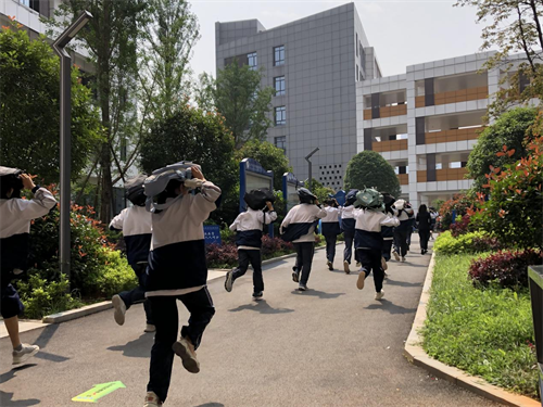 第二次警報(bào)響起,教師組織學(xué)生用雙手抱頭或書包護(hù)頭并小跑,迅速有序從安全通道緊急疏散到操場(chǎng)上安全空曠的場(chǎng)地。