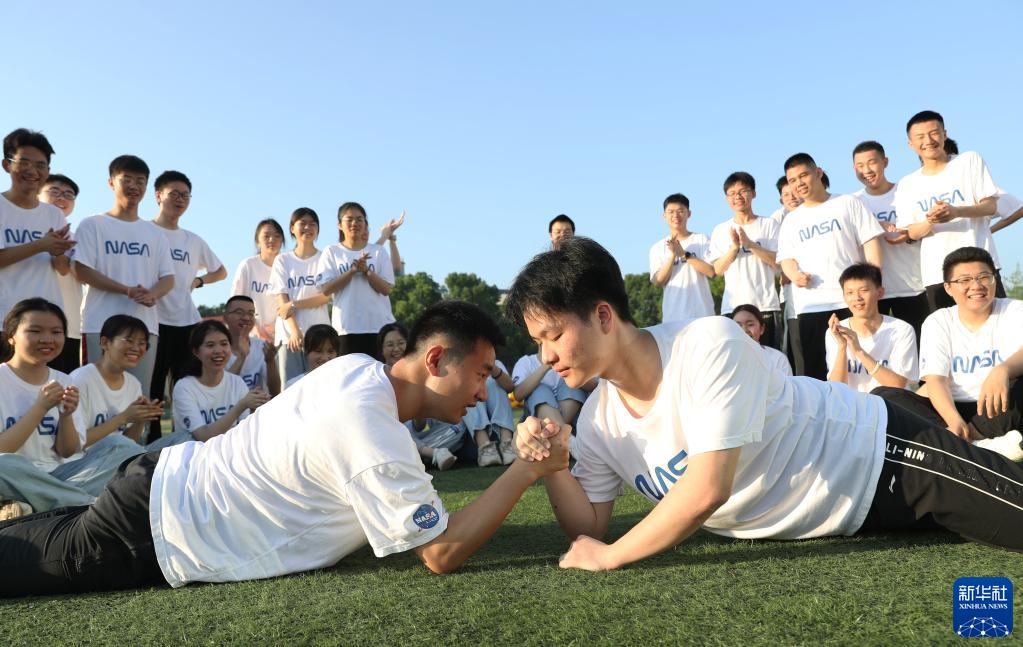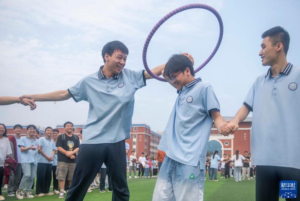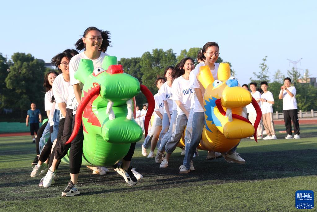 5月25日,在湖南省永州市道縣道州玉潭(東陽)學(xué)校,高三學(xué)生在操場上做減壓趣味活動。