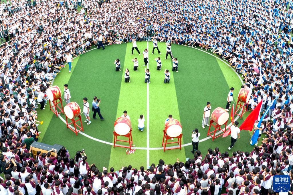 5月29日,湖北省宣恩縣第一高級中學(xué)學(xué)生在快閃活動中表演鼓舞(無人機照片)。
