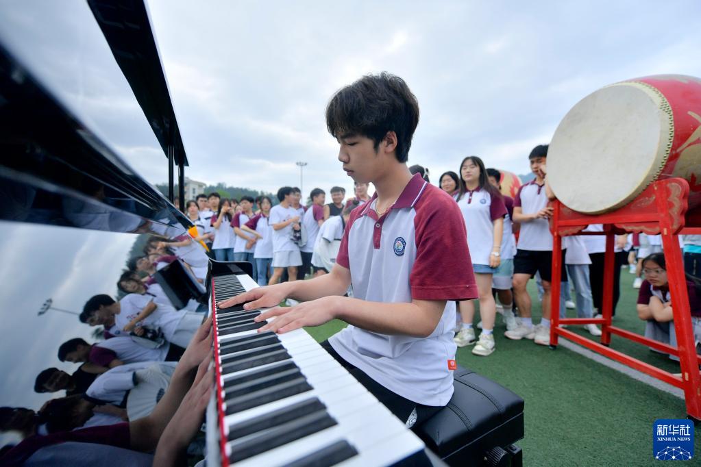 5月29日,在湖北省宣恩縣第一高級中學(xué)的快閃活動現(xiàn)場,學(xué)生在彈奏鋼琴。