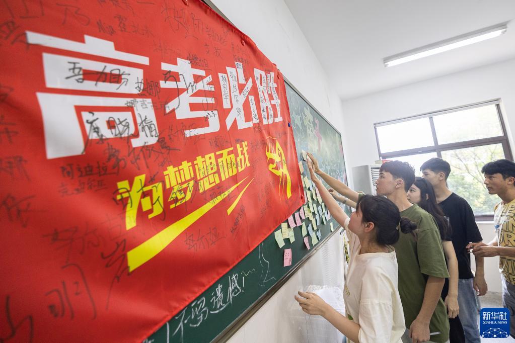 5月28日,在浙江省湖州市長興縣職業(yè)技術(shù)教育中心學(xué)校,高三學(xué)生在黑板上粘貼高考寄語。