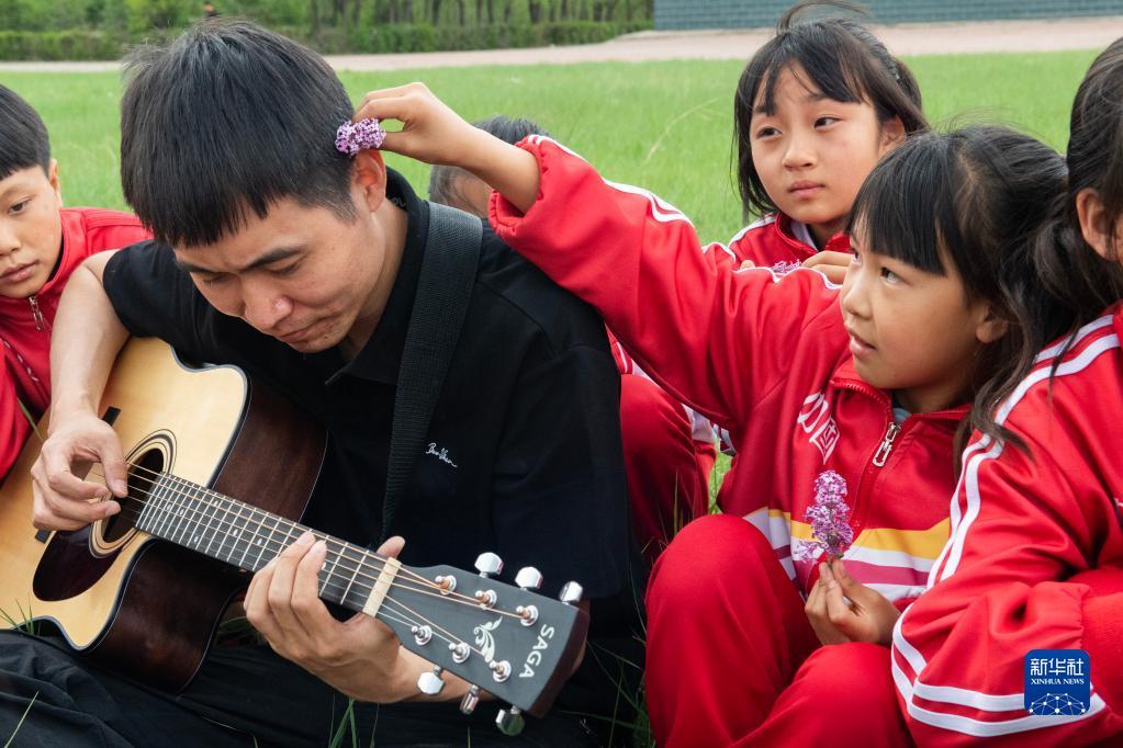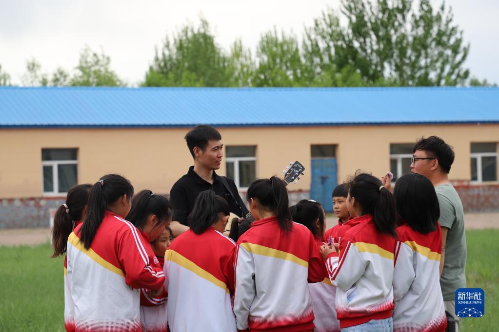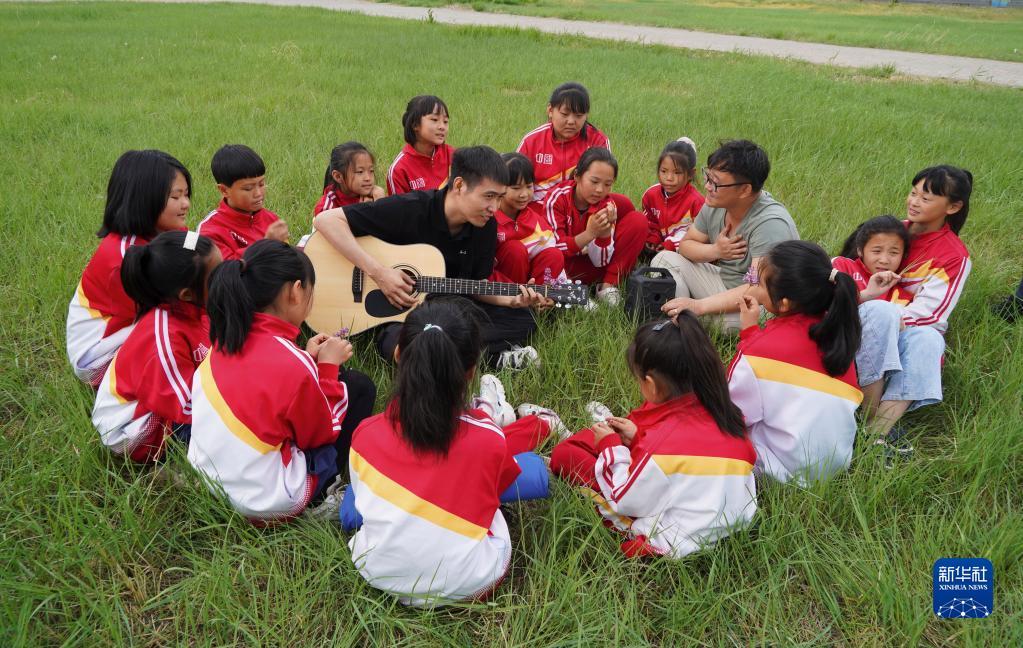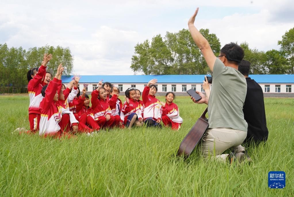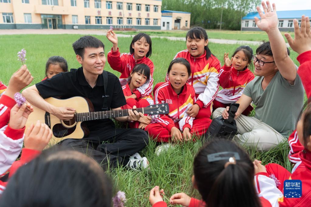 5月29日,在安達市任民鎮(zhèn)中心小學(xué),音樂老師在學(xué)校草坪上與音樂班的孩子們練習(xí)唱歌。