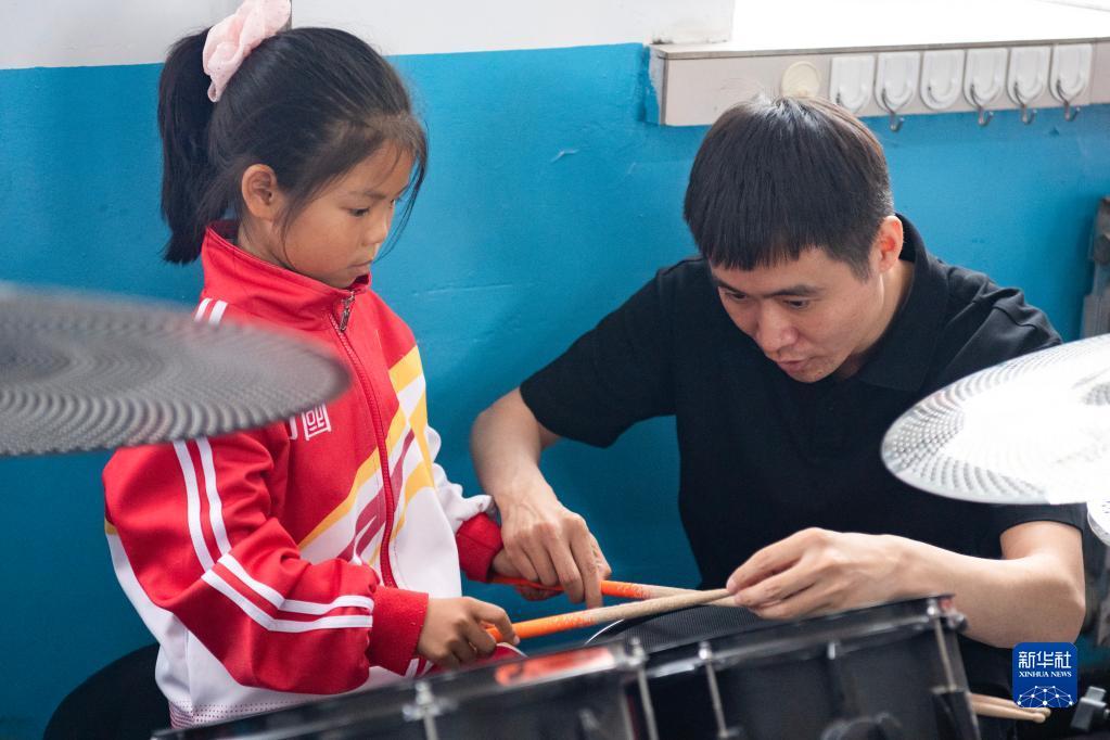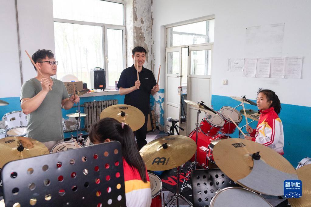 5月29日,在安達市任民鎮(zhèn)中心小學(xué),音樂老師教音樂班的孩子打架子鼓。