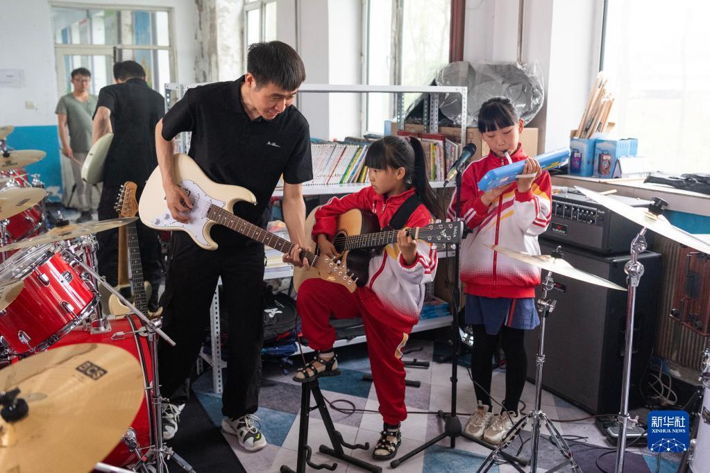 5月29日,在安達市任民鎮(zhèn)中心小學(xué),音樂老師李平指導(dǎo)音樂班的孩子進行樂隊排練。