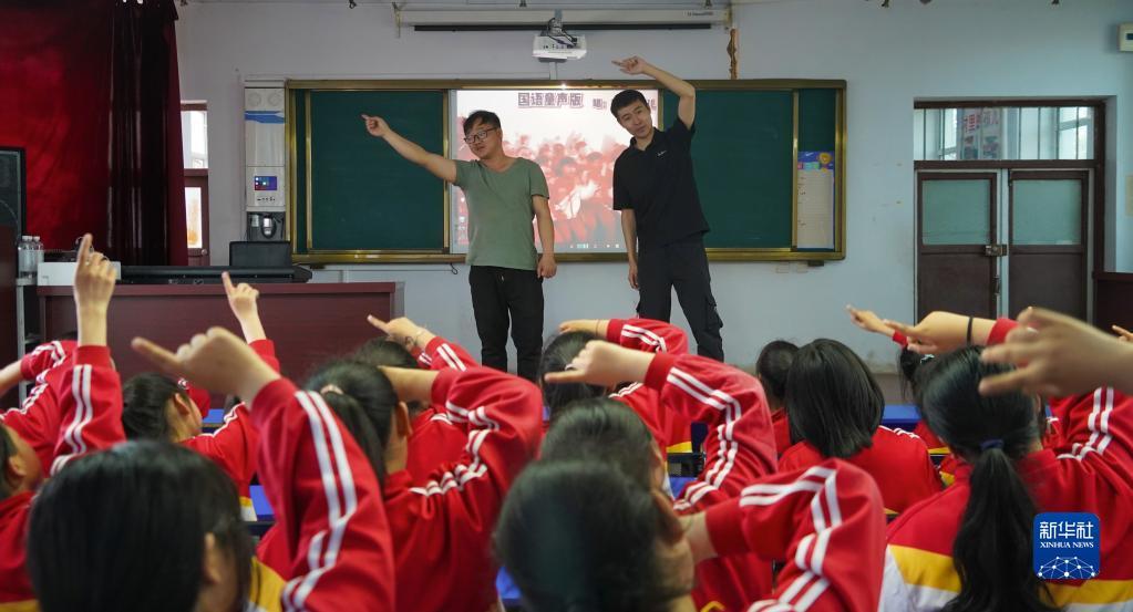 5月30日,在安達市任民鎮(zhèn)中心小學(xué),音樂老師李平(右)和張雨在教室內(nèi)指導(dǎo)音樂班的孩子們練習(xí)唱歌。