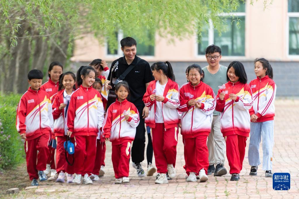 5月29日,在安達市任民鎮(zhèn)中心小學(xué),音樂老師和音樂班的孩子在校園中。