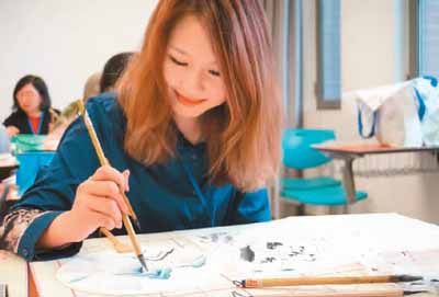華文教師在中國(guó)畫課堂上學(xué)畫畫。