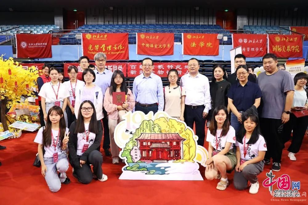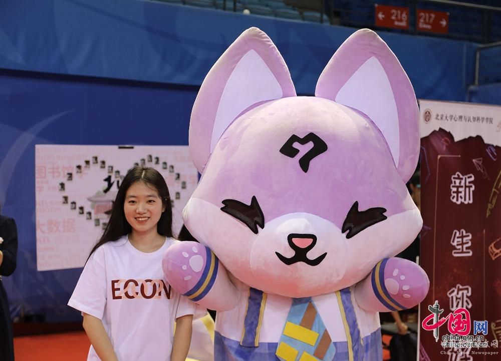 8月19日,北京大學邱德拔體育館,新生與學院的人偶、標識牌等進行合影留念。中國網(wǎng)記者 汪雅雯攝