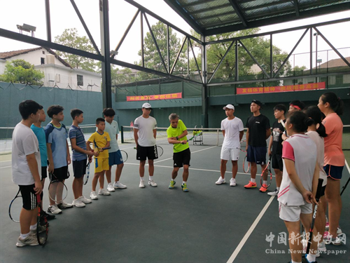 網(wǎng)球主教練龍平正在給隊員傳授技戰(zhàn)術(shù)。
