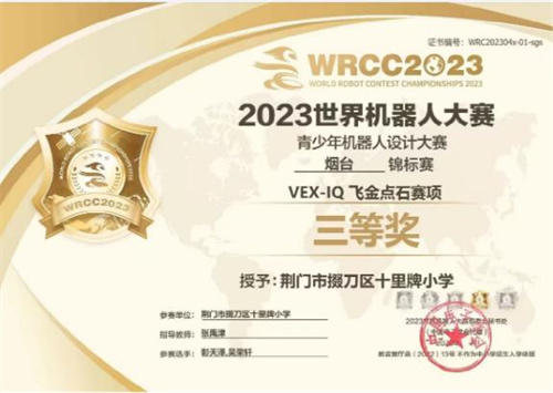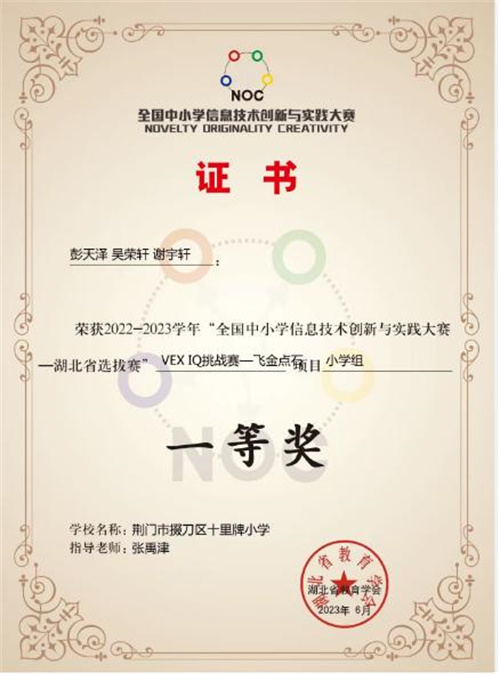 在2022-2023學(xué)年“全國中小學(xué)信息技術(shù)創(chuàng)新與實踐大賽湖北省選拔賽" VEX IQ挑戰(zhàn)賽二金點項目,該校榮獲小學(xué)組一個一等獎、一個二等獎。