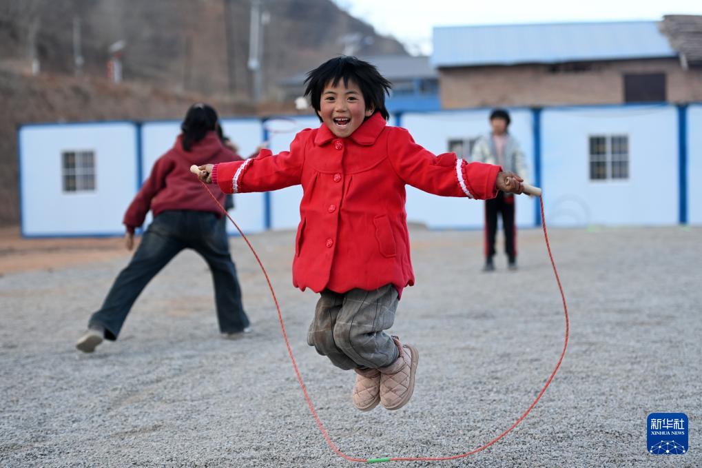 12月27日,在積石山縣大河家鎮(zhèn)梅坡小學(xué)臨時(shí)教學(xué)點(diǎn),學(xué)生在臨時(shí)操場(chǎng)跳繩。