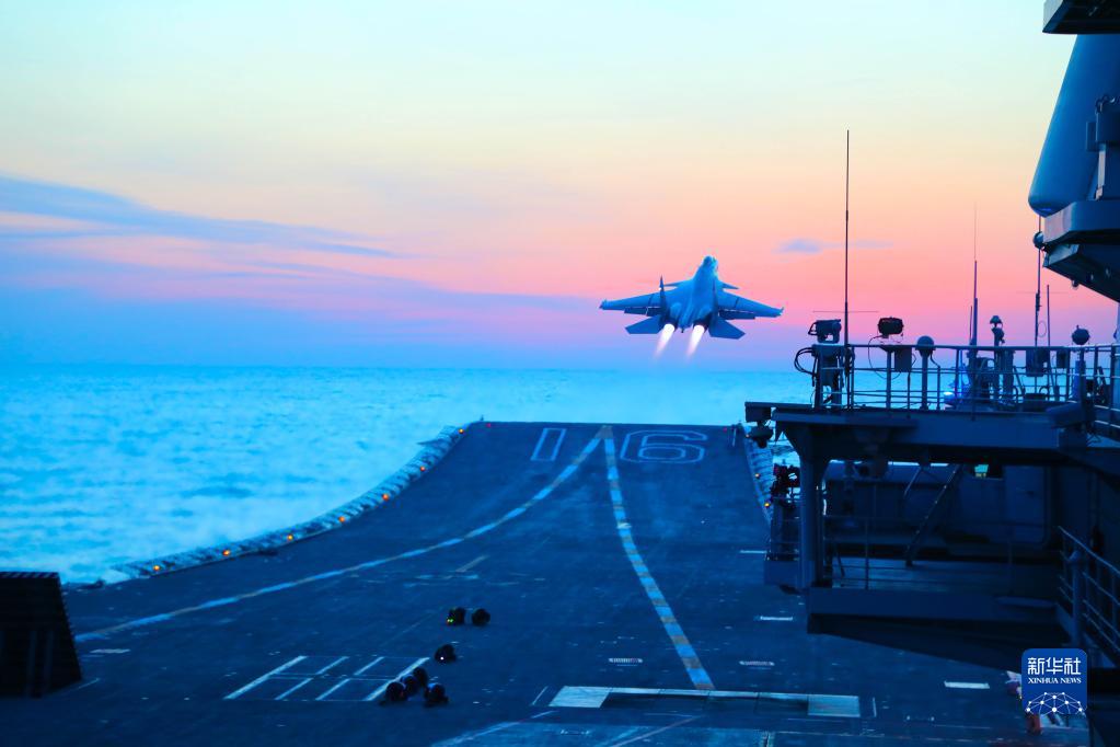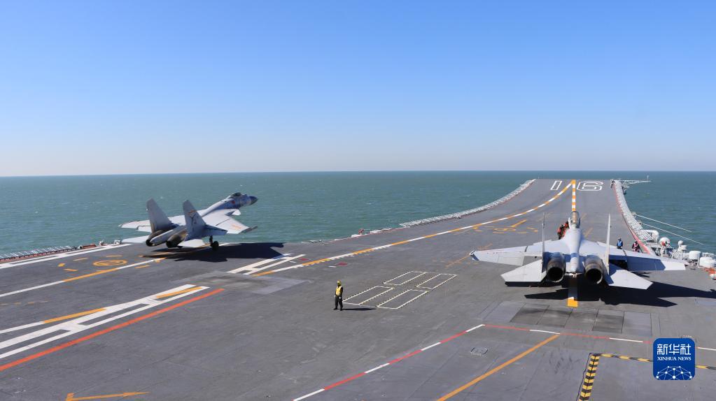 海軍航空大學(xué)某基地飛行員駕駛殲-15戰(zhàn)機(jī)進(jìn)行觸艦復(fù)飛(2021年10月20日攝)。新華社發(fā)(姜濤 攝)