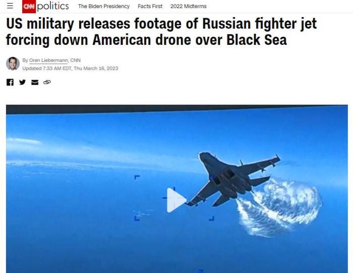 報道還稱,當俄羅斯蘇-27戰(zhàn)斗機再次靠近時,又一次“傾倒燃料”。隨后,俄羅斯蘇-27戰(zhàn)斗機與美國MQ-9“死神”無人機“相撞”,導致螺旋槳受損,無人機的視頻也由此中斷。不過,CNN同時指出,俄羅斯否認發(fā)生了“碰撞”。